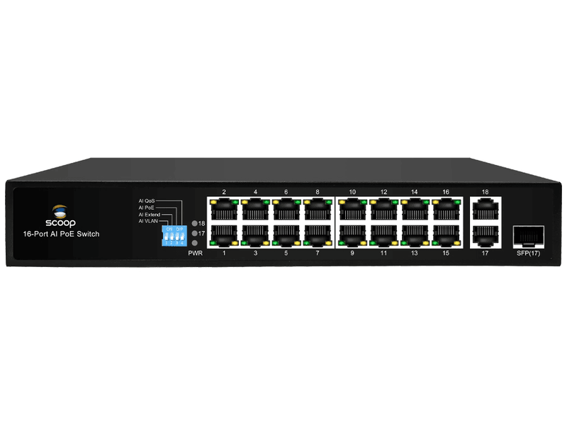 Scoop 16 Port Fast Ethernet AI PoE 150W 2 Gigabit 1SFP Switch